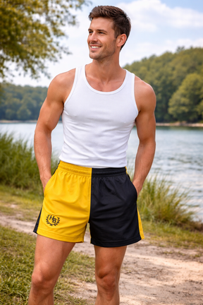 The striking two-tone design is the hallmark of the Nelson shorts, ensuring you make a bold statement and stand out from the crowd. This distinctive aesthetic is perfectly complemented by our finely embroidered Hazy Blue logo, a mark of quality and attention to detail.